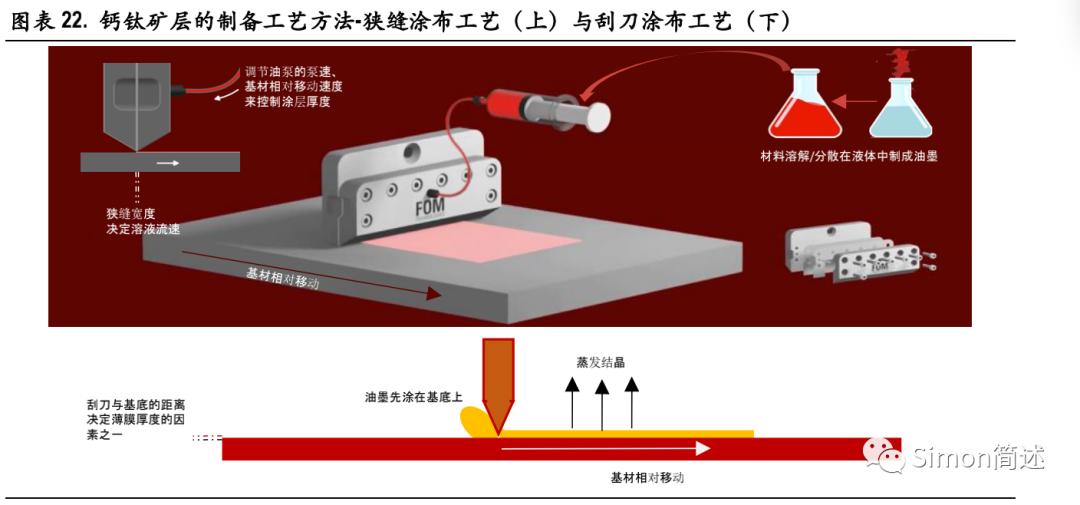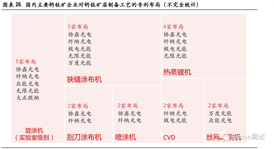 钙钛矿企业主要选择狭缝涂布工艺路线。我们对国内部分领先钙钛矿企业的公开专利进行统计,在钙钛矿层制备工艺的选择上,主要是狭缝涂布和蒸镀 PVD,而协鑫光电、纤纳光电等在刮涂、喷涂上也有尝试布局,此外 CVD、丝网印刷工艺属于少数选择方向。