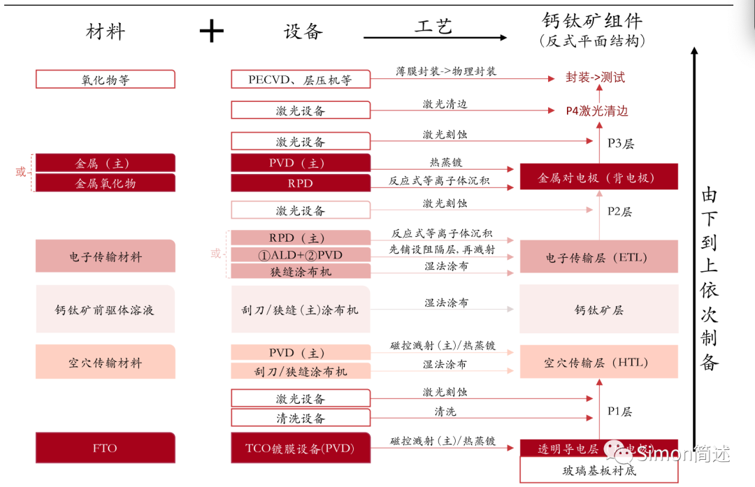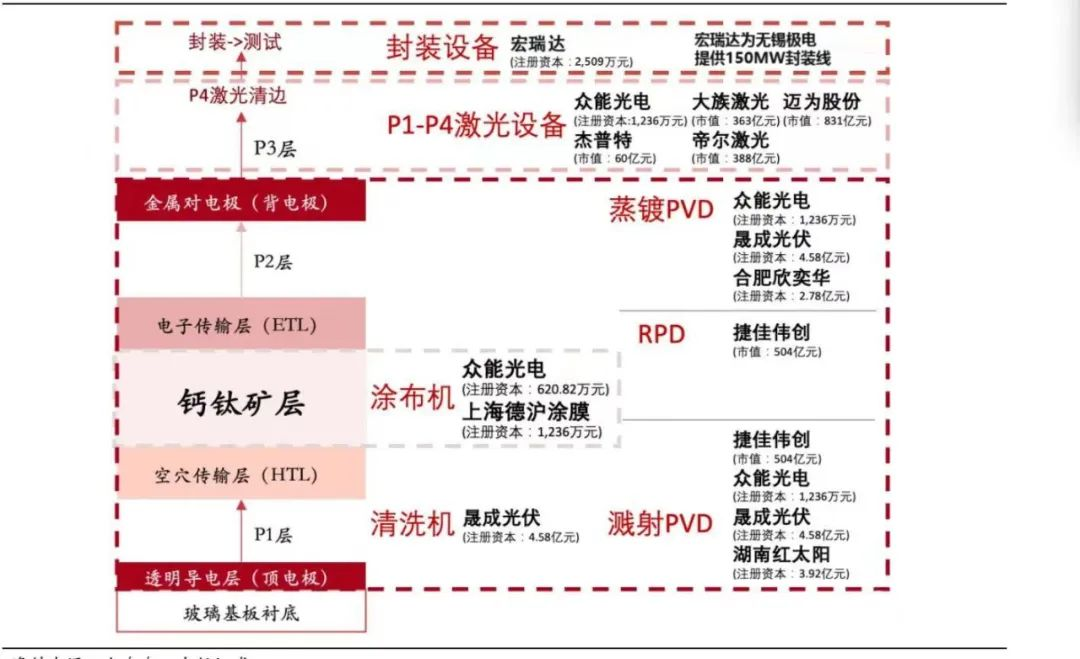 TCO 玻璃:从玻璃厂商直接采购,也可以在玻璃衬底上 PVD 溅射透明导电层,技术较成熟。 空穴传输层(核心层一):一般用溅射 PVD,亦可用蒸镀 PVD,最新研究尝试涂布机,技术难点在于工艺参数调整。 钙钛矿层(最核心层二):主流选用狭缝涂布工艺,技术难度较高,技术核心在于大面积制备的解决方案、成膜均匀性。 电子传输层(核心层三):主流用 RPD 设备;另一种是先用 RPD 或 ALD 制备一个很薄的阻隔层,再用溅射 PVD 做传输层;正研究尝试涂布机制备,技术难点在于材料适配和保护下方钙钛矿层。 背电极:用蒸镀 PVD 设备,已具备较成熟的技术应用。 激光刻蚀:共四道激光,主要用于 P1、P2、P3 层激光划线,使整个钙钛矿面板形成一道道的子电池,且子电池互相串联;P4 层激光用于清边处理,技术难度可控。 封装:较关键的环节,封装方案处于创新阶段,包括薄膜封装、物理封装等。