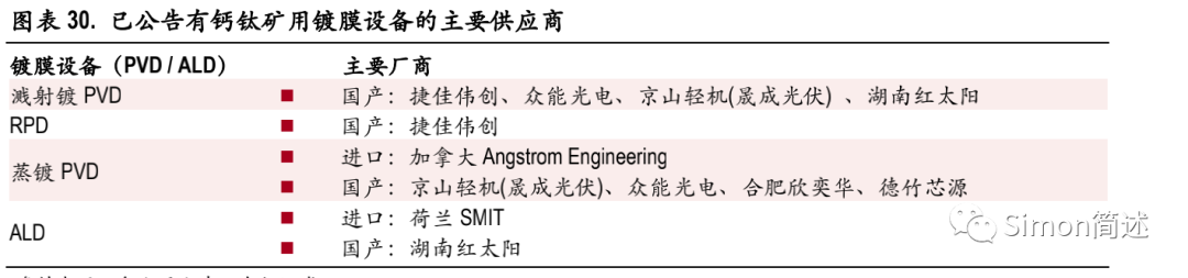 空穴传输层: PVD-溅射镀、PVD-RPD、涂布-刮刀涂布机 电子传输层:PVD-蒸镀、PVD-RPD、PVD-溅射镀、印刷-丝网印刷机 国产 PVD 设备商率先受益。尽管产业实验室、科研院所前期主要使用进口设备进行研发,而根据已公开信息,目前国内部分含钙钛矿用 PVD 的设备商已进入出货验证或完成验证阶段 (1)捷佳伟创向某领先钙钛矿厂商出货了―立式反应式等离子体镀膜设备”(RPD),并于 22/07 再次中标量产型 RPD订单; (2)京山轻机旗下晟成光伏的团簇型多腔式蒸镀设备已量产,并成功应用于多个客户端; (3)众能光电截至 21 年底的钙钛矿 PVD 设备出货量达 30 台套; (4)湖南红太阳的首台钙钛矿电池用 PVD 及ALD 镀膜设备发货,成功中标龙头客户钙钛矿电池项目。 (5)合肥欣奕华的蒸镀事业部有对真空蒸发法制备钙钛矿电池薄膜的研究。其中,不乏有已在 HJT 布局有 PVD 的捷佳伟创、湖南红太阳等,随着钙钛矿产线的逐步落地,国产设备商有望持续受益。