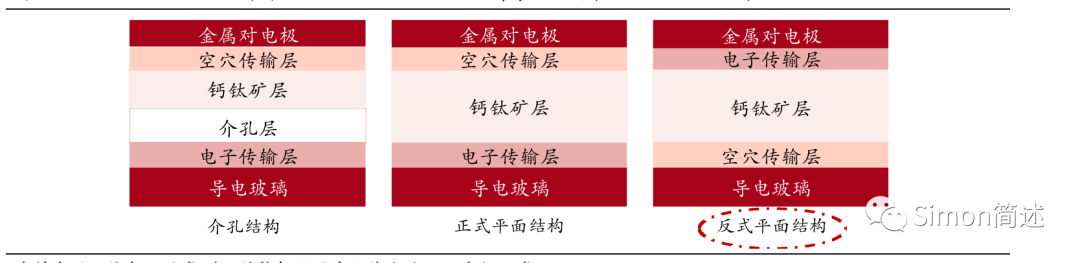 钙钛矿组件主要有 3 类结构框架,反式平面结构适合产业化。常见的 3 类“三明治”结构为介孔结构和平面结构(分为正式平面、反式平面,区别:钙钛矿底层材料对钙钛矿内的电子或空穴的提取能力不同,P 型半导体主要传递空穴,N 型半导体主要传递电子)。 转换效率比反式结构高,具有较高的 Voc 和 Jsc 值,但空穴传输层在核心的钙钛矿层上面,在选材的温度耐受性和性能平衡上还不能很好的匹配,且迟滞效应比反式结构明显(迟滞效应降低电池测试的准确性和电池性能); 2. 正式(n-i-p)介孔结构(优化版本,使钙钛矿层更稳定): 与正式平面结构类似,介孔层的掺杂能改善钙钛矿层和电子传输层的接触,提升电子的提取能力,但介孔层需要 450° C 高温烧结,不能和柔性衬底结合,不适宜投入量产。 比正式结构的工艺更简便价廉、低温成膜、更适合与传统光伏电池结合叠层器件等,同时因为反式 (p-i-n) 结构中,空穴层选材的扩散长度/系数比电子层的短/低,更有利于电荷的平衡抽取,从而抑制迟滞效应。由于适合叠层结构延伸及产业化、工艺成本低,为目前的主流结构。但面临转换效率较低、电子传输层用材昂贵和热稳定性差等限制。