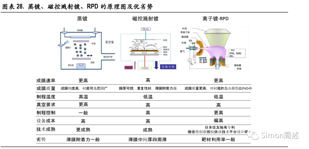 蒸镀、溅射镀、RPD 都属于 PVD 工艺。PVD(Physical Vapor Deposition)为物理气相沉积技术,在真空环境下将气化成分子/离子的材料源,通过低压气体/等离子体在衬底表面沉积成特定功能薄膜。根据工艺制程的不同,主要分为真空蒸发镀、真空溅射镀、真空离子镀。其中: 蒸发镀:蒸发器加热使靶材蒸发汽化成粒子,随后将该粒子直接射向衬底并完成沉积 溅射镀:通过高电压将靶材转化成等离子状态,利用高能量粒子撞击靶材后,被撞击出来的靶中分子或原子撞上衬底完成沉积 离子镀:利用高压气体放电将靶材蒸发后离子化,利用离子轰击衬底表面完成沉积。根据日本住友介绍,RPD(Reactive Plasma Deposition)也是离子镀的方法之一。