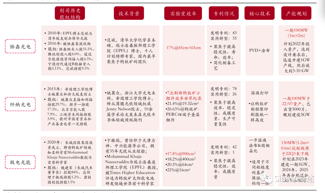 2、钙钛矿产业开启商业化探路,规划产能合计超 27GW。 尽管瑞士洛桑联邦理工学院 EPFL、牛津光伏、日本松下集团等海外机构的研发成果领先,但国内钙钛矿的技术转化速度领先,且技术储备和资本等因素都具备的情况下,钙钛矿产业化可以迅速实现从 0 到 1 的飞跃。协鑫光电、纤纳光电和极电光能等头部厂商已接近或开启商业化探路阶段。 协鑫光电:最早聚焦于钙钛矿的团队,腾讯创投和宁德时代参股,实现 45*65cm 尺寸 17%的实验室效率,拥有 43 项授权和审查中的发明专利及 35 项实用新型专利, 100MW 量产线 22年投产。 纤纳光电:与协鑫光电有着类似的发展路径,产业化进度最快,在 2022 年 7 月实现 alpha 组件量产并出货给地面光伏电站使用,实现了全球首款钙钛矿组件商业化应用,开启商业化探路。 极电光能:背靠长城控股集团,预计年内完成 150MW 试制线,进度追平协鑫光电。宏瑞达在钙钛矿光伏组件封装自动化上为无锡极电定制交付了150MW的封装线。