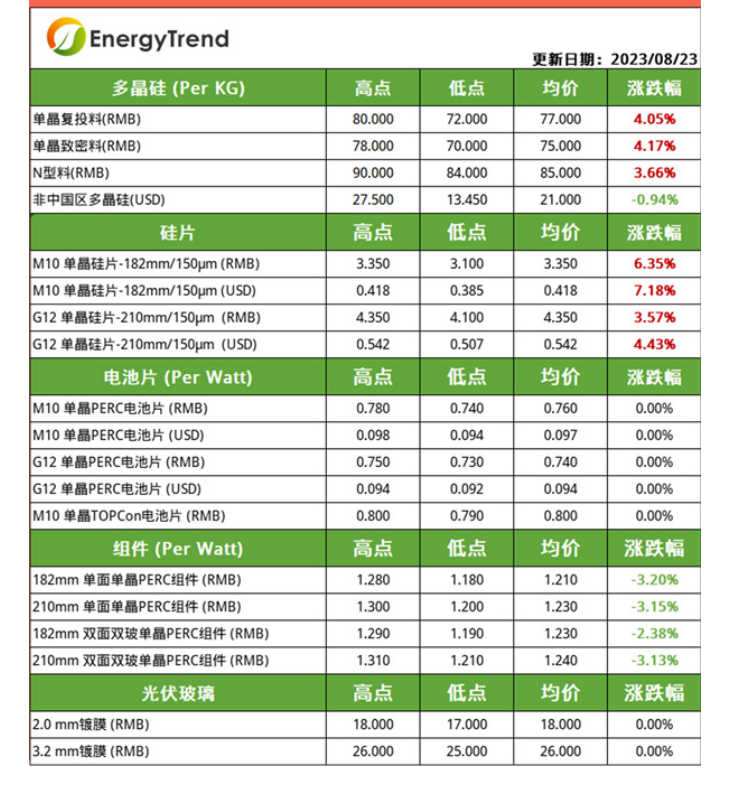 M10电池片主流成交价为0.76元/W;G12电池片主流成交价为0.74元/W;M10 单晶TOPCon电池人民价格为 0.8元/W。