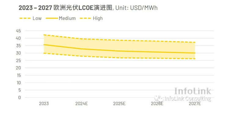 此外,考虑到2023年上游硅料价格的回落,导致下游组件价格下跌,欧洲光伏的度电成本(LCOE)也在逐渐降低。InfoLink以每瓦0.194美元的组件价格进行测算,2023年欧洲光伏的LCOE约为34.9美元/ MWh,如果未来趋势保持稳定,预计到2027年后,LCOE有望进一步降至29.5美元/ MWh以下。凭借在众多再生能源中较为低廉的LCOE和完善的供应链,光伏也将持续作为欧洲乃至全球能源转型的主流选择。