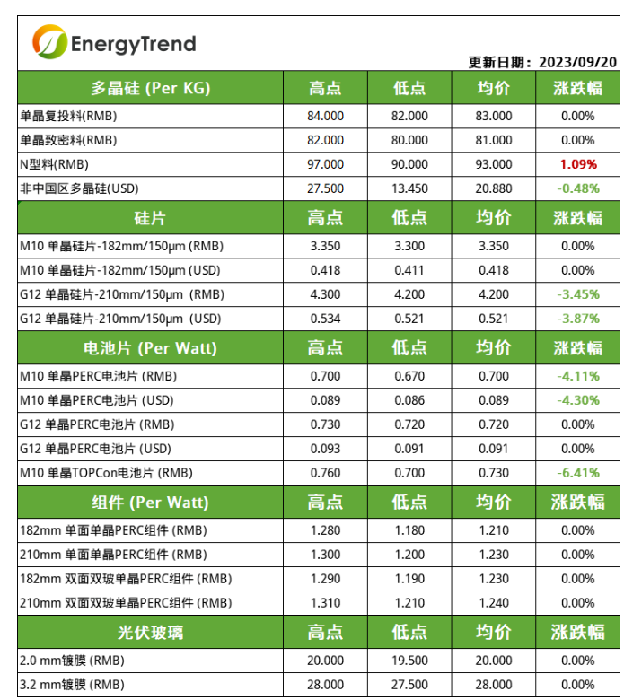 本周电池片价格延续下跌趋势,M10电池片主流成交价为0.70元/W,G12电池片主流成交价为0.72元/W,M10单晶TOPCon电池人民价格为0.73元/W