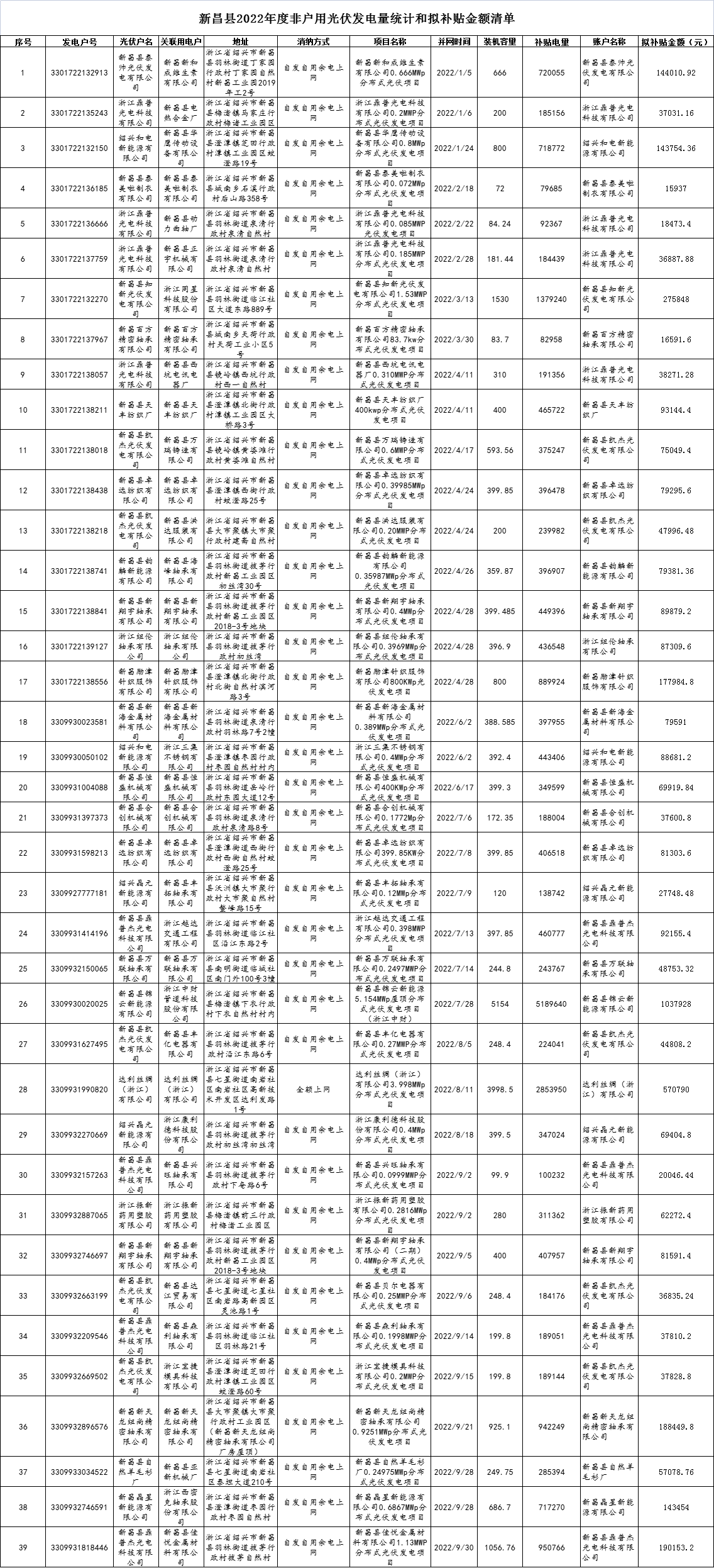 10月25日,浙江新昌县发改局发布《关于2022年度全县非户用光伏发电量统计及拟补贴金额的公示》。根据公示名单,本次拟补贴项目全部为户用分布式项目,总计39个项目,容量24.14MW,补贴金额总计456.105万元。