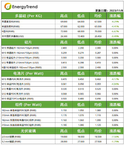 本周硅料价格跌势延续,单晶复投料主流成交价格为67元/KG,单晶致密料的主流成交价格为65元/KG;N型料报价为70元/KG。