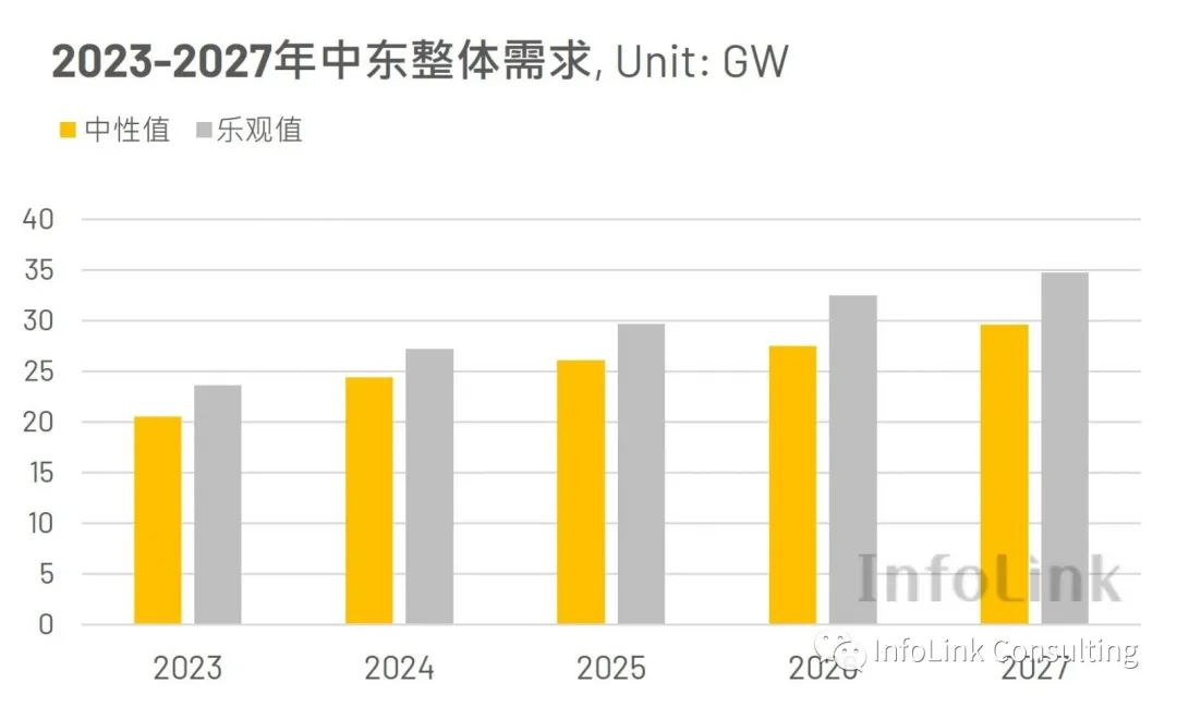 经InfoLink调研2023年的中东需求约落在20.5-23.6GW,则因以巴战争所带来的影响,预计明年部分国家需求量将出现减少,但因沙特、阿联酋等主力国家的大型项目仍持续进行中,以及政府不断推出大型标案等,预计未来整体中东需求仍保持乐观。