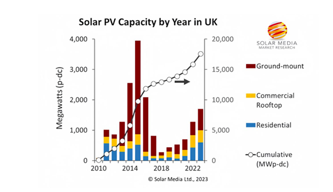 倘若2023年英国新增光伏装机量能够达到1.7GW,那么将与2022年同期相比增长33%。而2023年推动英国光伏装机容量增长的除了光伏电站的建设之外,还有英国户用光伏市场的发展。2010年,在引入上网电价补贴后,英国户用光伏市场就开启了高速增长的状态。据悉,当时的电价为43便士/kwh。