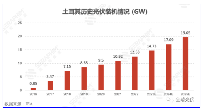 值得注意的是,土耳其是世界第四大光伏组件生产国,年产能为7.96 GW,仅次于中国、越南和韩国。