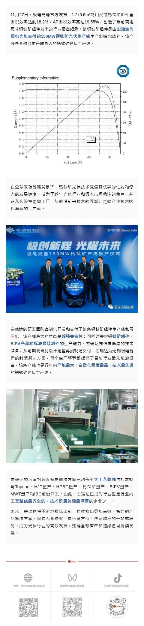 宏瑞达祝贺极电光能再创商用尺寸钙钛矿组件效率行业新高