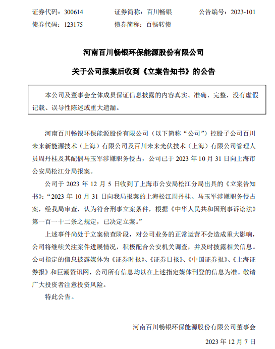 12月7日,河南百川畅银环保能源股份有限公司发布公告称,控股子公司百川未来新能源技术(上海)有限公司及百川未来光伏技术(上海)有限公司管理人及其配偶涉嫌职务侵占,公司已于2023年10月31日向上海市公安局松江分局报案。