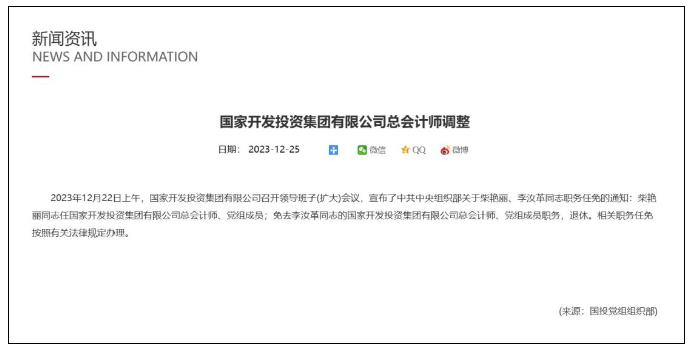 国家开发投资集团有限公司网站12月25日消息,12月22日上午,国家开发投资集团有限公司召开领导班子(扩大)会议,宣布了中共中央组织部关于柴艳丽、李汝革同志职务任免的通知:柴艳丽同志任国家开发投资集团有限公司总会计师、党组成员;免去李汝革同志的国家开发投资集团有限公司总会计师、党组成员职务,退休。相关职务任免按照有关法律规定办理。