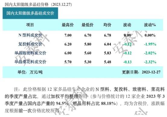 本周大部分企业都开始洽谈新一批订单,部分企业已有成交,其中n型硅料有6家企业成交,p型硅料有4家企业成交,且p型料的签单量较小。目前的签单进度基本只到1月月初,预计下周内仍有一定规模的新增成交。