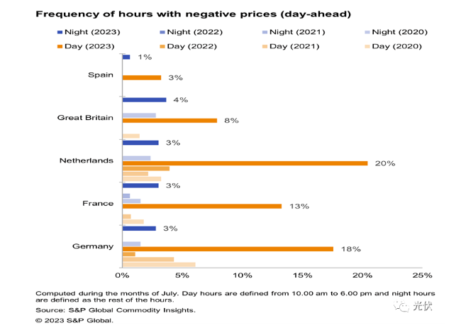 2023年夏季已经显示出高度饱和的迹象。欧洲大多数国家,负价格出现的频率已经达到了历史新高,荷兰最近白天时段以20%的负价格领先。