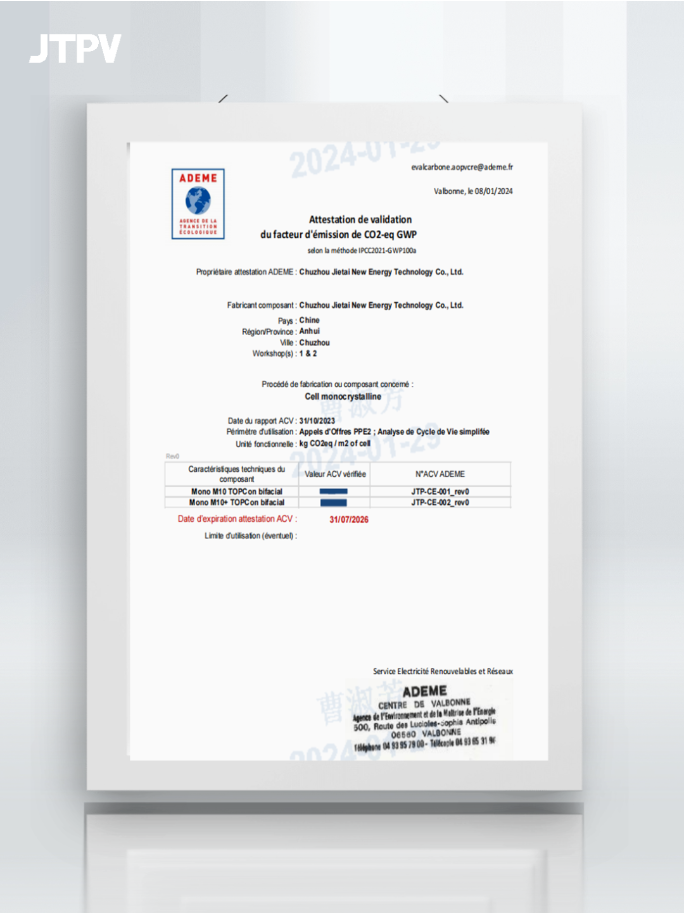 在可持续发展方面,捷泰科技将继续关注环境保护和节能减排,致力于生产更具环保性能和高效性的光伏产品。捷泰科技N型TOPCon产品已顺利通过ADEME法国碳足迹认证和ISO14067产品碳足迹认证,这充分证明了产品在环保性能、高效性等方面的优势,为产品进军国际市场提供了坚实保障。