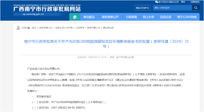 国际能源网获悉,3月11日,广西南宁市行政审批局发布关于年产光伏级200吨超细银粉项目环境影响报告书的批复。根据批复文件显示,产光伏级200吨超细银粉项目建设地点在南宁市兴宁区,工程总投资5000万元,其中环保投资205万元,环保投资占总投资的4.1%。