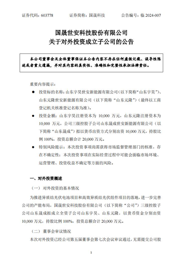 国际能源网获悉,3月20日晚间,国晟科技发布公告,为推进异质结光伏电池项目和高效异质结光伏组件项目的落地,进一步完善公司的产能布局,公司三级控股子公司山东晟成世安新能源有限公司(简称“山东晟成”)拟成立全资子公司山东宇昊世安新能源有限公司(简称“山东宇昊”)、山东元隆世安新能源有限公司(简称“山东元隆”),以货币资金分别出资1亿元,持股比例100%,投资总额合计2亿元。