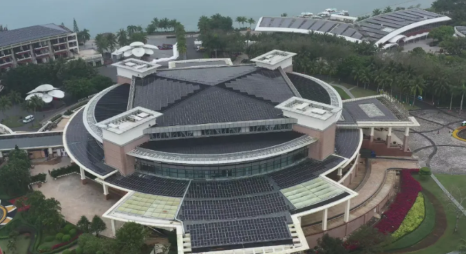 ▲博鳌亚洲论坛首次实现全场馆绿电自给自足。图为主场馆屋顶的光伏设备。宋印官/摄