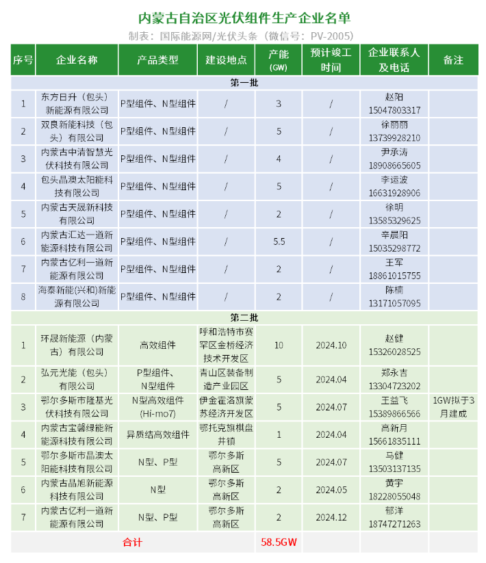 国际能源网获悉,3月27日,内蒙古工信厅发布《关于发布内蒙古自治区光伏装备生产企业名单(第二批)的通知》。根据公示名单显示,7家光伏组件企业入选,包括环晟光伏、弘元绿能、隆基绿能、宝馨科技、晶澳科技等企业。支架企业有15家入选,合计产能230万吨。今年2月,内蒙古工信厅曾公布《关于发布内蒙古自治区光伏组件生产企业名单的通知》,有8家企业入选。前后两批共计13家企业,组件产能58.5GW。