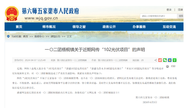 国际能源网获悉,4月7日,新疆兵团第六师五家渠市一〇二团梧桐镇发布声明,对关于近期网传“102光伏项目”进行辟谣。