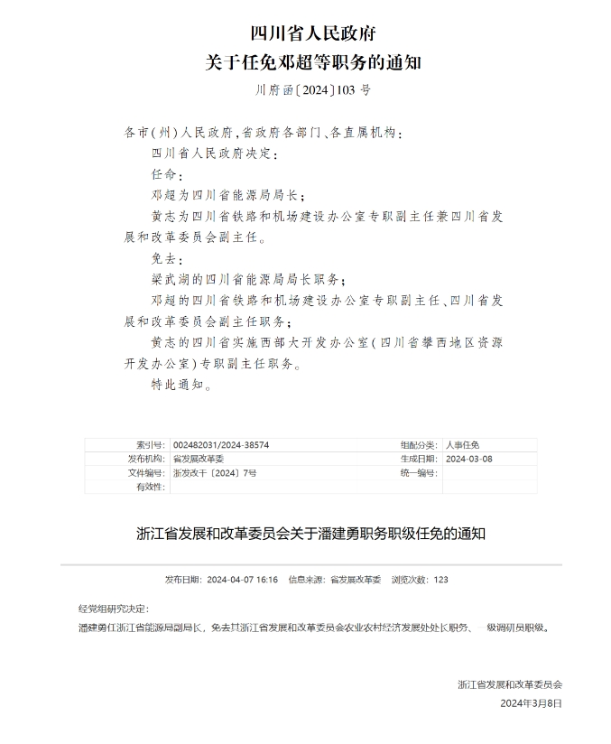 4月8日,四川省人民政府人民发布关于任免邓超等职务的通知。