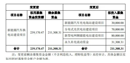 公告显示,新能源汽车换电站建设项目拟使用募集资金投资额约23.92亿元,累计投入募集资金约2.79亿元,剩余募集资金约21.13亿元。