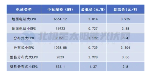 从中标价格来看,在地面电站项目中,大EPC中标均价3.515元/W,最高价为3.925元/W,项目为长顺新能源马家山一期、猫落孔农业光伏电站光伏场区项目;最低价为3.105元/W,项目为湖口武山二期70MW农光互补项目。小EPC中标均价为1.077元/W,最高价为4.295元/W,项目为英德横石塘农光互补光伏项目;最低价为0.91元/W,项目为国能米东区60万千瓦光伏二期项目,其中光伏组件、逆变器均由发包人提供。