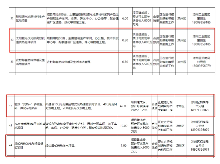 国际能源网获悉,4月8日,武威市人民政府发布《武威市2024年投资机会清单(新能源及装备制造产业链项目)》,其中包含3个光热项目。概算投资总额达43.8亿元。
