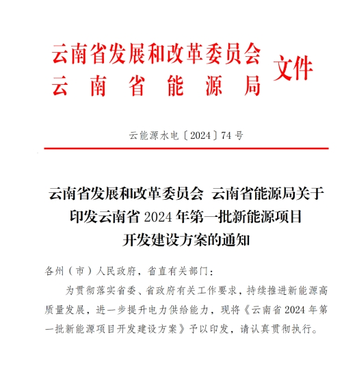 4月25日,云南省发改委及能源局联合发布《关于印发云南省2024年第一批新能源项目开发建设方案的通知》。《通知》指出,纳入云南省2024年第一批新能源项目开发建设方案实施的项目共141个,总规模1018.325万千瓦。其中,光伏项目规模1006.36万千瓦,风电11.965万千瓦。
