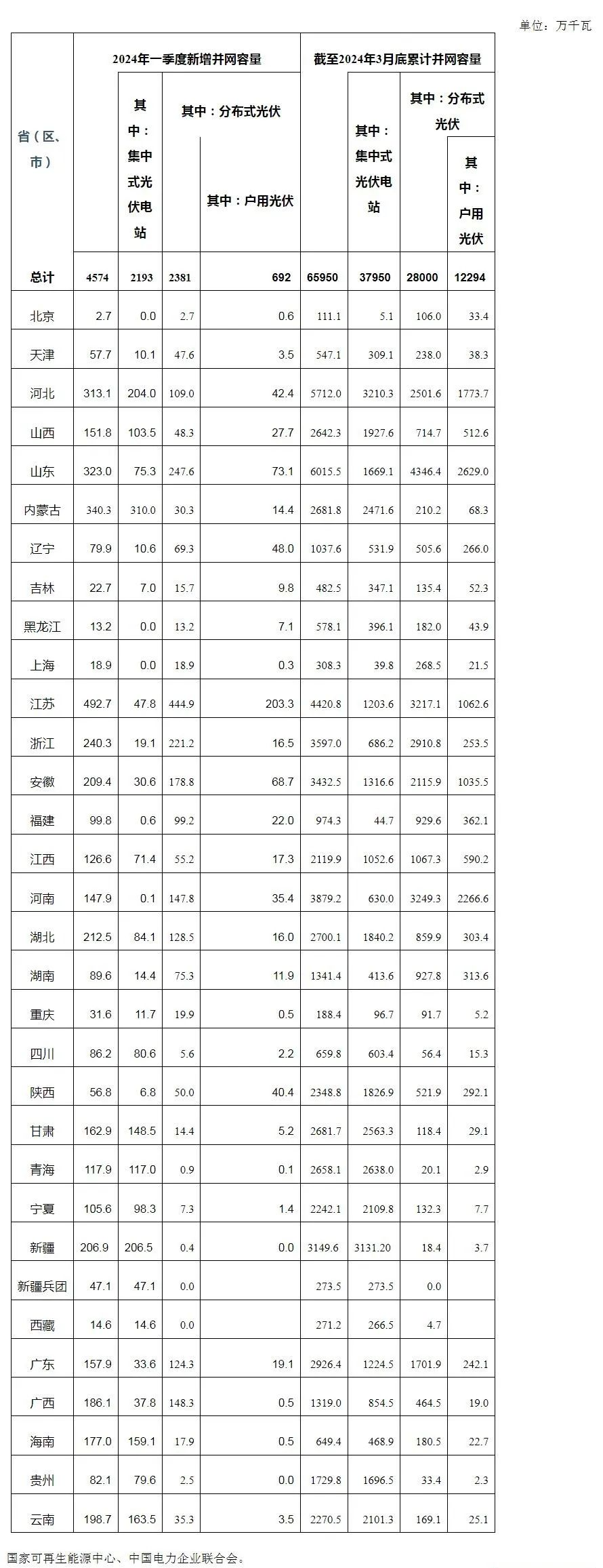 截至2024年3月底累计并网光伏发电容量65950万千瓦,其中集中式光伏累计并网37950万千瓦,分布式光伏累计并网28000万千瓦。户用光伏累计并网12294万千瓦,工商业光伏累计并网15706万千瓦。