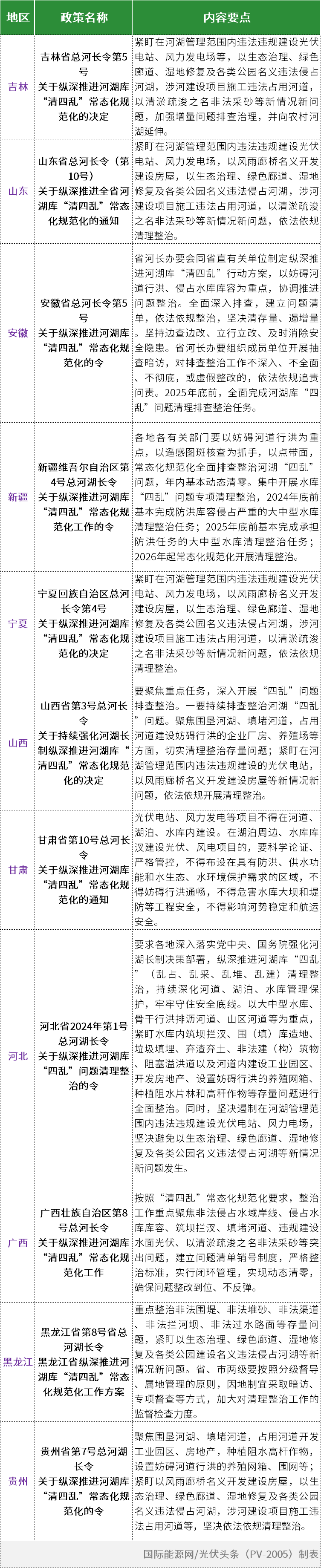 其他省份虽未具体明确光伏行为,但在文件中要求持续排查整治河湖“四乱”问题,违规建设水面光伏也包含在其内。
