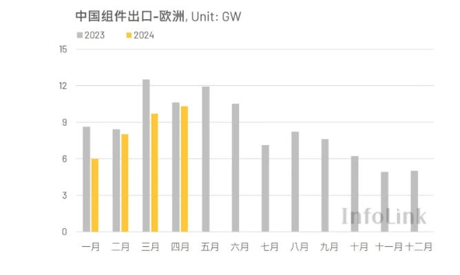 InfoLink海关数据显示,2024年4月中国共出口约20.9GW的光伏组件,相比三月的24.5GW环比下降15%;对比2023年4月的18.1GW同比则上升15%。