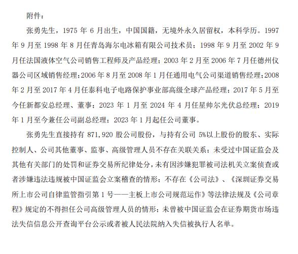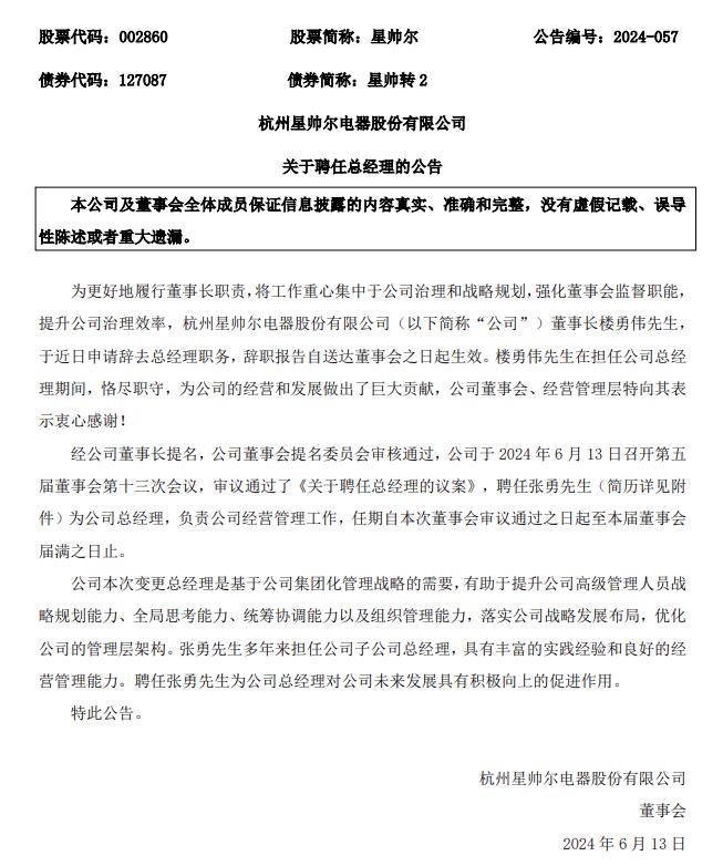 北极星太阳能光伏网获悉,6月14日,星帅尔发布《关于聘任总经理的公告》,根据公告,星帅尔董事长楼勇伟先生,于近日申请辞去总经理职务,辞职报告自送达董事会之日起生效。经公司董事长提名,公司董事会提名委员会审核通过,聘任张勇先生为公司总经理,负责公司经营管理工作,任期自本次董事会审议通过之日起至本届董事会届满之日止。