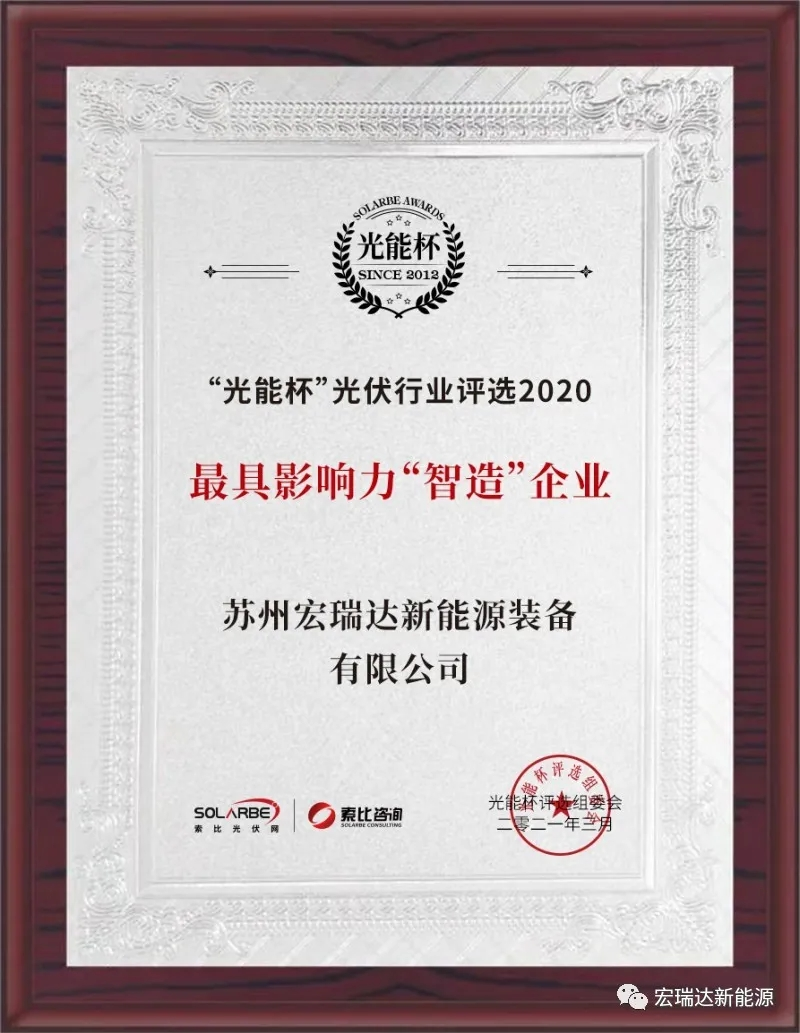 此次光能杯共有300余家光伏企业参与报名评选,经过激烈的角逐,宏瑞达凭借领先的创新力、稳定的品质、优质的服务和品牌影响力,撷取2020年“最具影响力智造企业”大奖,实至名归。宏瑞达将再接再厉,继续用实际行动和创新研发致力于光伏智能装备的迭代升级,助推我国碳达峰、碳中和目标的实现,并以此带动装备行业绿色发展再上新台阶。