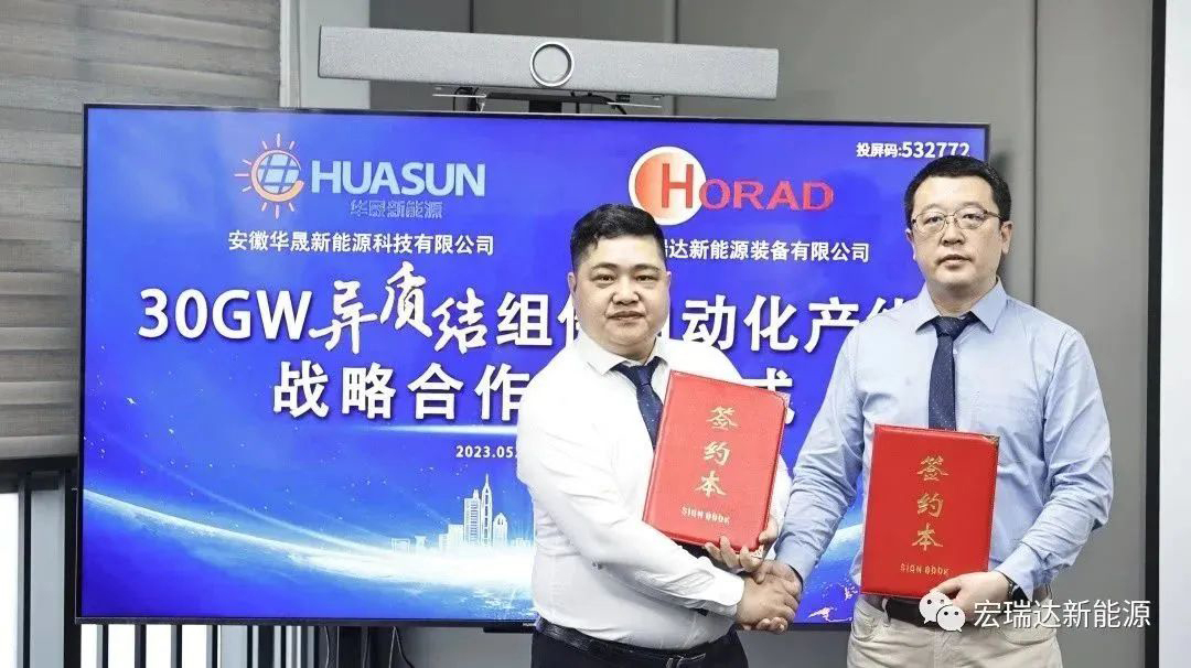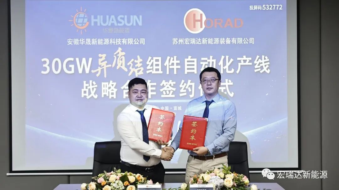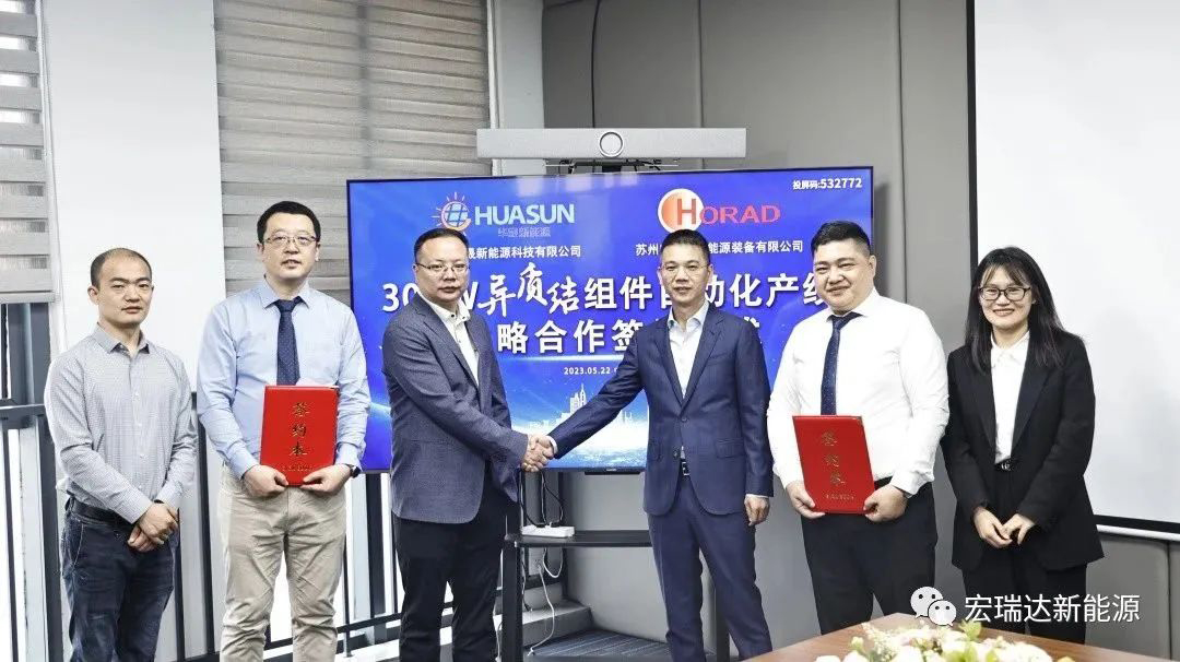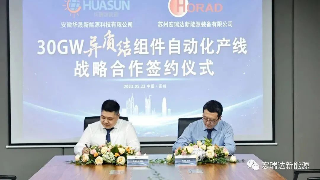 2023年5月22日,苏州宏瑞达新能源装备有限公司(以下简称“宏瑞达”)与异质结龙头安徽华晟新能源科技有限公司(以下简称“华晟新能源”)在异质结之都安徽宣城再度牵手,共同签署战略合作协议,结成深度战略合作伙伴关系,达成战略合作意向。华晟董事长徐晓华先生、采购总监檀华先生与宏瑞达董事长廖满元先生、销售总监徐国柱先生及双方团队共同见证了本次签约仪式。