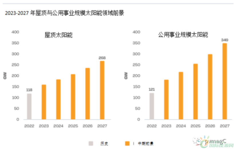 在全球范围内,2023年公用事业规模光伏装机量预计将达到182 GW,与上一年相比增长51%。2024年的预测量为218 GW,且到2027年将进一步增长至349 GW。