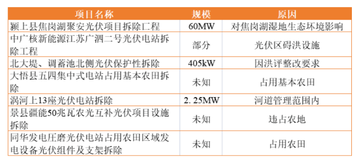 此外,其他项目因光伏区碍洪设施、位于红线区内、洪评、占据河道等原因,均导致了因用地为题的拆除,部分项目其拆除后尚能异地重建,更多的项目则只能对设备进行妥善保存或以二手名义在相关网站进行招拍挂。